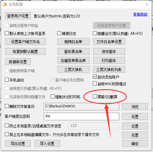 对于如何禁止用户访问共享文件期间,通过QQ截屏的方式泄露商业机密,我们可以在大势至共享文件管理软件界面上点击“全局设置”,勾选“屏蔽QQ截屏”,如图: