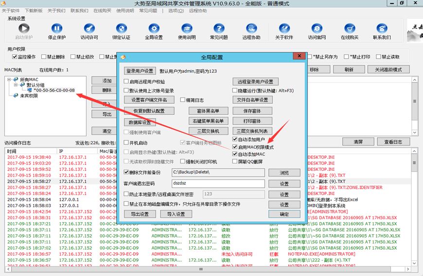 如果想要为局域网内不同电脑设置不同的访问权限,则需要将软件默认的用户名模式改为MAC地址模式,方法是点击软件顶部“全局设置”,勾选“启用MAC权限模式”,这样,左侧的用户列表就会变为MAC地址列表,如下图所示: