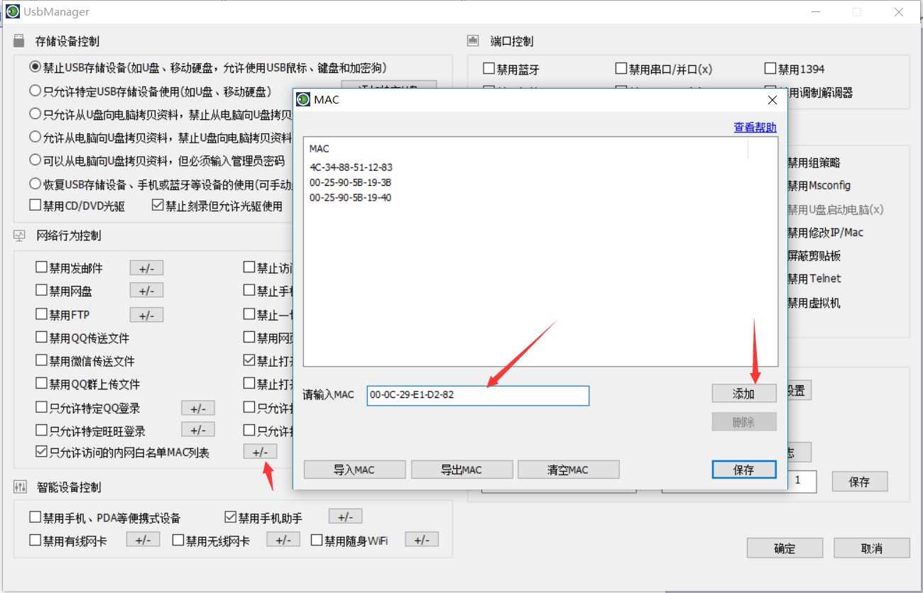同时,特别注意的是,如果启用“自动隔离非授权机器”之后,发现安装管理端的控制机本身无法上网,则只需要将控制机的MAC地址加入到“隔离白名单”即可。如下图所示: