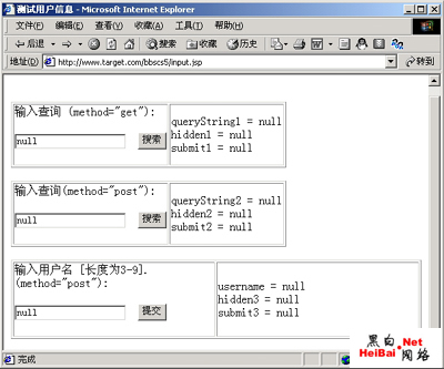 网页对查询窗体不会做任何输入验证,但是对用户名称的窗体则会。将数据填入窗体,来测试一下网页的漏洞,例子如下:
