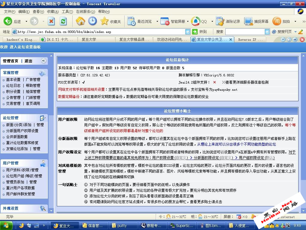 。光在这里面也看不出什么来,页面比较简单,可利用的地方不多。值得庆幸的是有个"在线论坛",打开看看,原来是动网的,嘿嘿。用默认的用户名和密码尝试登录,居然成功了进入了后台,