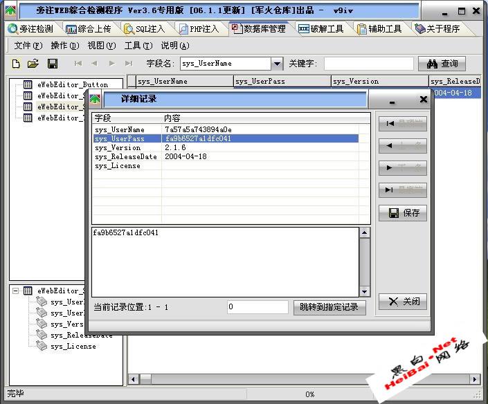尝试默认的用户名和密码发现无法登录进去,看来密码改过了。没关系,反正我们能列文件嘛。再利用动网列文件的漏洞找到了ewebeditor的数据库文件,下载回来,用明小子的数据库管理功能打开,查看了管理员密码的MD5散列,