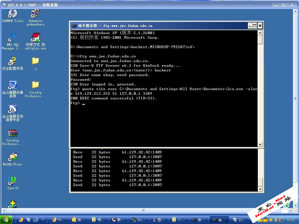 到这里就已经完全控制了复旦大学的主站了!虽然主站的操作系统是Linux,但是我们通过先控制一台windows的3389肉鸡再进行对目标的嗅探攻击收到了如期的效果。可见嗅探攻击的威力的确非比寻常,不注意这方面的防范也必将被人恶意入侵!既然是Linux的系统,管理员一般都是用SSL来远程管理服务器的,嘿嘿。扫描一下主站服务器,发现开了22端口(SSL的默认连接端口为22)尝试用嗅到的FTP用户名和密码登录SSL居然成功了,