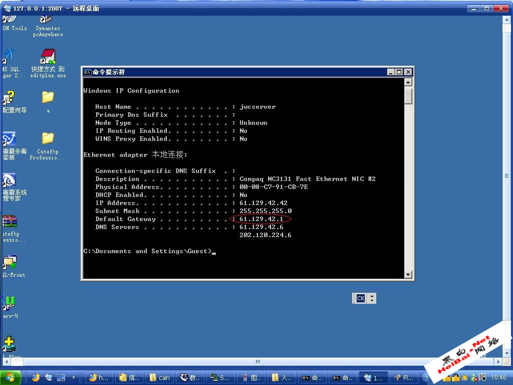 。到这里我们就已经成功控制了61.129.42.42这台服务器。接下来就是安装cain进行嗅探了,具体请参照我的另一篇关于嗅探入侵的文章。在61.129.42.42上执行"ipconfig /all"命令得知默认网关为61.129.42.1,