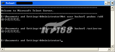三、命令行建立隐藏超级用户 首先通过使用OpenTelnet.exe工具来开启远程主机的TELNET服务,然后TELNET远程登陆得到一个shell,创建一个新的帐户,命令为: