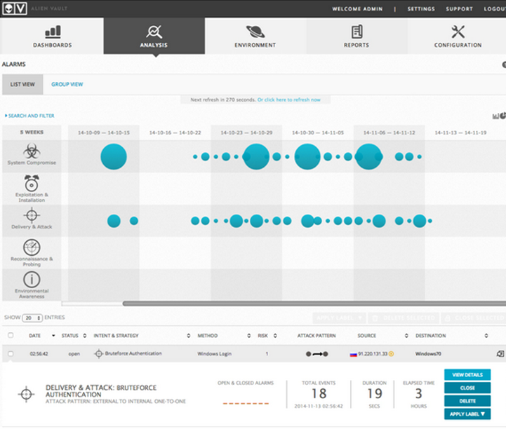 安全研究人员开发了一个由内置关联规则驱动的IDS(入侵检测系统)和记录关联系统,它可以及时通知你是否受到了攻击者的暴力破解攻击。系统警报仪表会显示所有的威胁,并按威胁级别分类。