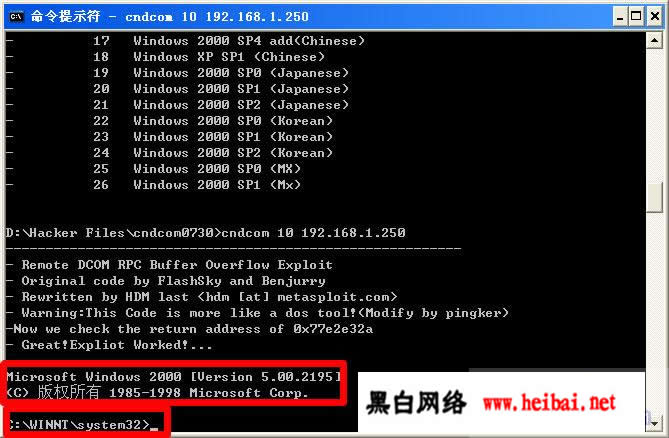黑客软件:cndcom.exe(包含一个DLL文件cygwin1.dll),它就是利用RPC溢出的入侵程序,针对几乎所有的WINDOWS版本。在命令提示符下输入”cndcom 10 218.22.123.26“,接着要耐心等待 :