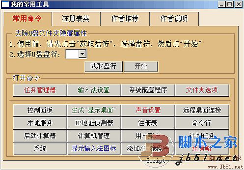 ①添加常用命令,如:打开输入法设置、声音设置、系统配置程序等;另外,专门添加了“生成显示桌面”功能,帮助误删了快捷方式显示桌面的朋友找回“显示桌面”功能。