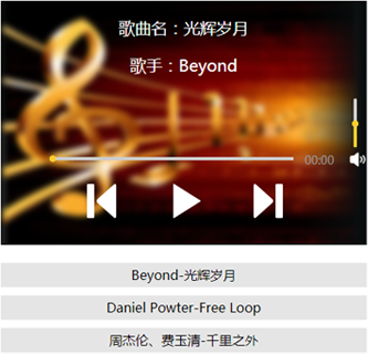这个音乐播放器的结构主要分为三部分:歌曲信息、播放器和播放列表,我们重点介绍一下播放器部分。首先在播放器中放三个audio标签用于播放: