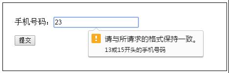 <p>手机号码:<input type="text" name="phoneNumber" pattern="[1]([3]|[5])[0-9]{9}" title="13或15开头的手机号码" /></p>
