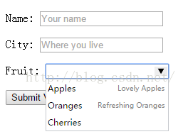 <form method="post" action="http://titan:8080/form"> <p><label for="name">Name: <input placeholder="Your name" id="name" name="name"/></label></p> <p><label for="city">City: <input placeholder="Where you live" id="city" name="city"/></label></p> <p><label for="fave">Fruit: <input list="fruitlist" id="fave" name="fave"/></label></p> <button type="submit">Submit Vote</button> </form> <datalist id="fruitlist"> <option value="Apples" label="Lovely Apples"/> <option value="Oranges">Refreshing Oranges</option> <option value="Cherries"/> </datalist>