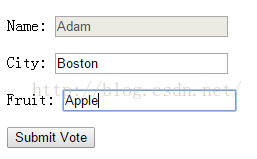 <form method="post" action="http://titan:8080/form"> <p><label for="name">Name: <input value="Adam" disabled id="name" name="name"/></label></p> <p><label for="city">City: <input value="Boston" readonly id="city" name="city"/></label></p> <p><label for="fave">Fruit: <input value="Apple" id="fave" name="fave"/></label></p> <button type="submit">Submit Vote</button> </form>