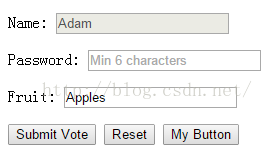 <form method="post" action="http://titan:8080/form"> <p><label for="name">Name: <input value="Adam" disabled id="name" name="name"/></label></p> <p><label for="password">Password: <input type="password" placeholder="Min 6 characters" id="password" name="password"/></label></p> <p><label for="fave">Fruit: <input value="Apples" id="fave" name="fave"/></label></p> <input type="submit" value="Submit Vote"/> <input type="reset" value="Reset"/> <input type="button" value="My Button"/> </form>