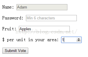 <form method="post" action="http://titan:8080/form"> <p><label for="name">Name: <input value="Adam" disabled id="name" name="name"/></label></p> <p><label for="password">Password: <input type="password" placeholder="Min 6 characters" id="password" name="password"/></label></p> <p><label for="fave">Fruit: <input value="Apples" id="fave" name="fave"/></label></p> <p><label for="price">$ per unit in your area: <input type="number" step="1" min="0" max="100" value="1" id="price" name="price"/></label></p> <input type="submit" value="Submit Vote"/> </form>
