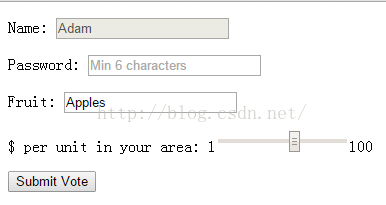 <form method="post" action="http://titan:8080/form"> <p><label for="name">Name: <input value="Adam" disabled id="name" name="name"/></label></p> <p><label for="password">Password: <input type="password" placeholder="Min 6 characters" id="password" name="password"/></label></p> <p><label for="fave">Fruit: <input value="Apples" id="fave" name="fave"/></label></p> <p><label for="price">$ per unit in your area: 1<input type="range" step="1" min="0" max="100" value="1" id="price" name="price"/>100</label></p> <input type="submit" value="Submit Vote"/> </form>