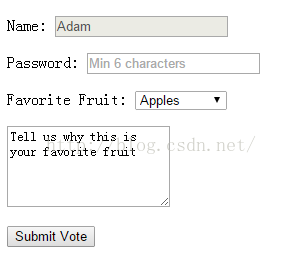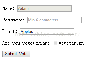 <form method="post" action="http://titan:8080/form"> <p><label for="name">Name: <input value="Adam" disabled id="name" name="name"/></label></p> <p><label for="password">Password: <input type="password" placeholder="Min 6 characters" id="password" name="password"/></label></p> <p><label for="fave">Fruit: <input value="Apples" id="fave" name="fave"/></label></p> <p><label for="veggie">Are you vegetarian: <input type="checkbox" id="veggie" name="veggie"/>vegetarian</label></p> <input type="submit" value="Submit Vote"/> </form>
