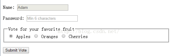 <form method="post" action="http://titan:8080/form"> <p><label for="name">Name: <input value="Adam" disabled id="name" name="name"/></label></p> <p><label for="password">Password: <input type="password" placeholder="Min 6 characters" id="password" name="password"/></label></p> <p><fieldset> <legend>Vote for your favorite fruit</legend> <label for="apples"> <input type="radio" checked value="Apples" id="apples" name="fave"/> Apples </label> <label for="oranges"> <input type="radio" value="Oranges" id="oranges" name="fave"/> Oranges </label> <label for="cherries"> <input type="radio" value="Cherries" id="cherries" name="fave"/> Cherries </label> </fieldset></p> <input type="submit" value="Submit Vote"/> </form>