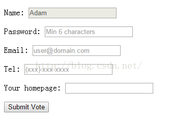 <form method="post" action="http://titan:8080/form"> <p><label for="name">Name: <input value="Adam" disabled id="name" name="name"/></label></p> <p><label for="password">Password: <input type="password" placeholder="Min 6 characters" id="password" name="password"/></label></p> <p><label for="email">Email: <input type="email" placeholder="user@domain.com" id="email" name="email"/></label></p> <p><label for="tel">Tel: <input type="tel" placeholder="(xxx)-xxx-xxxx" id="tel" name="tel"/></label></p> <p><label for="url">Your homepage: <input type="url" id="url" name="url"/></label></p> <input type="submit" value="Submit Vote"/> </form>