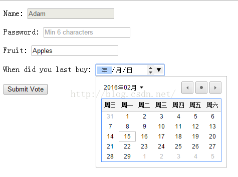 <form method="post" action="http://titan:8080/form"> <p><label for="name">Name: <input value="Adam" disabled id="name" name="name"/></label></p> <p><label for="password">Password: <input type="password" placeholder="Min 6 characters" id="password" name="password"/></label></p> <p><label for="fave">Fruit: <input value="Apples" id="fave" name="fave"/></label></p> <p><label for="lastbuy">When did you last buy: <input type="date" id="lastbuy" name="lastbuy"/></label></p> <input type="submit" value="Submit Vote"/> </form>