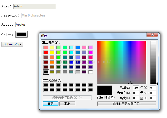 <form method="post" action="http://titan:8080/form"> <p><label for="name">Name: <input value="Adam" disabled id="name" name="name"/></label></p> <p><label for="password">Password: <input type="password" placeholder="Min 6 characters" id="password" name="password"/></label></p> <p><label for="fave">Fruit: <input value="Apples" id="fave" name="fave"/></label></p> <p><label for="color">Color: <input type="color" id="color" name="color"/></label></p> <input type="submit" value="Submit Vote"/> </form>