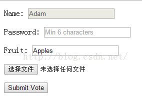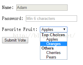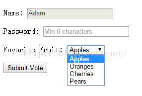 <form method="post" action="http://titan:8080/form" enctype="multipart/form-data"> <p><label for="name">Name: <input value="Adam" disabled id="name" name="name"/></label></p> <p><label for="password">Password: <input type="password" placeholder="Min 6 characters" id="password" name="password"/></label></p> <p><label for="fave"> Favorite Fruit: <select id="fave" name="fave"> <option valu="apples" selected label="Apples">Apples</option> <option valu="oranges" label="Oranges">Oranges</option> <option valu="cherries" label="Cherries">Cherries</option> <option valu="pears" label="Pears">Pears</option> </select> </label></p> <input type="submit" value="Submit Vote"/> </form>