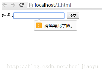 html5 中新增的required属性可以应用在大多数输入元素上(除了隐藏元素,图片元素按钮上)。在提交时,如果元素中内容为空白。则不允许提交,同时在浏览器中显示信息提示文字,提示用户这个元素中必须输入内容,效果如图