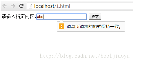 之前提到的新增的input元素,比如email,number,URL等,要求输入内容符合一定的格式,对input元素使用pattern属性,并且将属性值设置为某个格式的正则表达式,在提交时会检查其内容是否符合给定格式。当输入的内容不符合给定格式时,则不允许提交,同时在浏览器中显示信息提示文字,提交输入的内容必须符合给定格式,代码如下,要求输入内容为一个数字与3个大写字母: