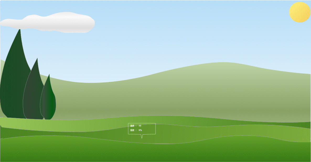 除了func属性外,还可以设置value属性作为默认值,如果对应的func取得的值为undefined或者null时,则会采用value属性定义的默认值,详情可见HT for Web数据绑定手册(http://www.hightopo.com/guide/guide/core/datamodel/ht-datamodel-guide.html)。例如,在这里,'tips1.json'文件中对阳光值进行数据绑定的结果如下: