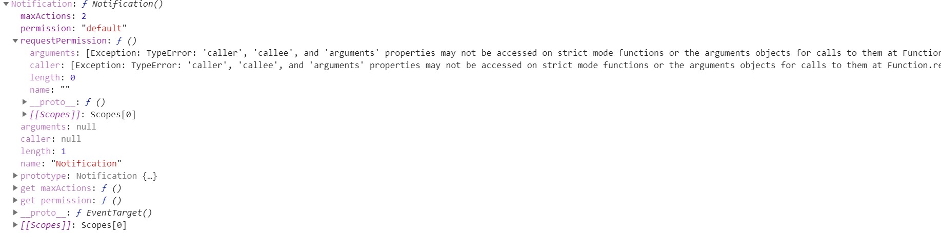 值得注意的是: requestPermission()方法仅在Notification对象有效,实例对象无效!!!这个方法是用来向用户申请显示通知的权限,只能被用户主动去调用(在页面onload中可以调用,可以向用户申请,之后再去发送...)
