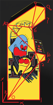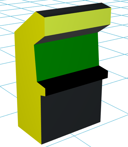 已经有个侧边了,我们可以将坐标系延z轴移动一定距离后得到另一个侧边的坐标数组同时再根据没个面的不同,分别设置 is 数组,将所有的面组合起来后,我们就将初步得到一个街机模型: