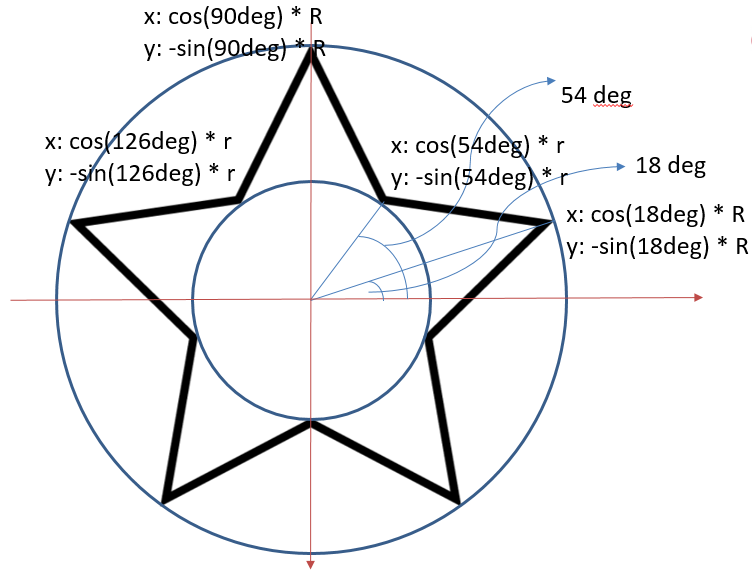 通过对五角星分析,我们可以确定各个顶点坐标的规律,这里需要注意的一点是:在canvas中,Y轴的方向是向下的。