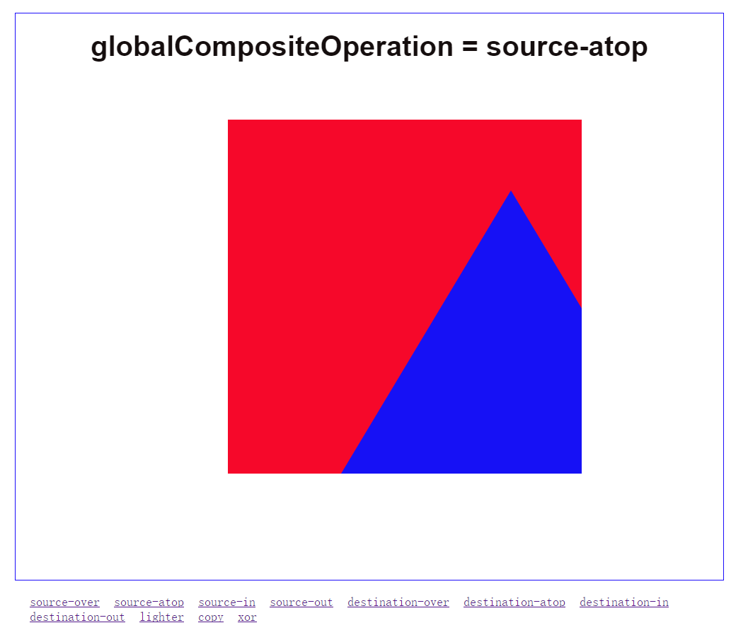 | source-atop | 在目标图像顶部显示源图像。源图像位于目标图像之外的部分是不可见的 |