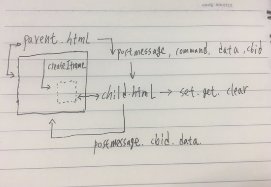 懒得拿工具画图了,因为流程比较清晰,这里拿文字复述一下整个通讯流程,首先父页面创建一个隐藏的iframe,然后当执行set,get,clear等command的时候,通过postMessage来进行消息广播,子页面接收到消息后,解析命令,数据和回调id(postMessage无法传递函数和引用,兼容问题导致,最好只传string类型,所以还需要对data做stringify)。然后当子页面处理完localstorage的操作后,再通过postMessage把对应的cbid和data返回给父页面,父页面监听message事件,处理结果。