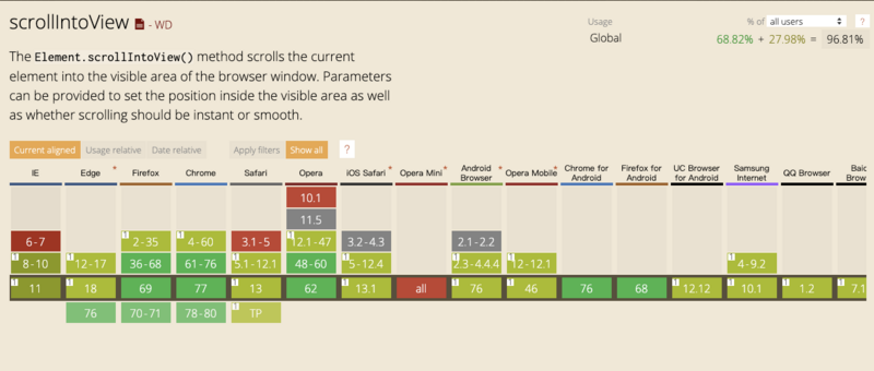 behavior表示滚动方式。auto表示使用当前元素的scroll-behavior样式。instant和smooth表示直接滚到底和使用平滑滚动。block表示块级元素排列方向要滚动到的位置。对于默认的writing-mode: horizontal-tb来说,就是竖直方向。start表示将视口的顶部和元素顶部对齐;center表示将视口的中间和元素的中间对齐;end表示将视口的底部和元素底部对齐;nearest表示就近对齐。inline表示行内元素排列方向要滚动到的位置。对于默认的writing-mode: horizontal-tb来说,就是水平方向。其值与block类似。scrollIntoView 浏览器兼容性