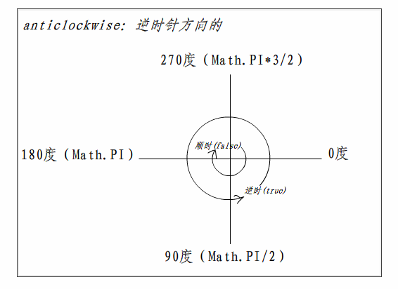 ctx.arc(x, y, radius, startAngle, endAngle, anticlockwise);x, y 圆弧中心, radius 圆弧半径, startAngle 起始点, endAngle 圆弧终点, anticlockwise 默认为顺时针, true逆时针