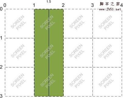 如下图,假如我想绘制一条从(1,0)到(1,3)的线,由于线的默认宽度是一个像素,所以在我想象中应该绘制成深绿色的部分,即在坐标 1 两边各占半个像素的宽度。