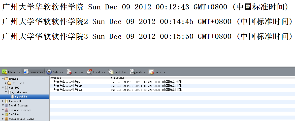 tx.executeSql("INSERT INTO mytable (mytitle, timestamp) values(?, ?)", ["广州大学华软软件学院3", d.toLocaleString()], null, null);