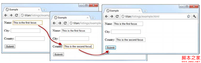 <label>Country: <input type="text" name="country" tabindex="2"/></label>
