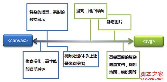 到目前为止,SVG与Canvas的主要特性均已经总结完毕了。它们都是HTML5中支持的2D图形展示技术,而且均支持向量图形。现在,我们就来比对一下这两种技术,分析一下它们的长处和适用场景。