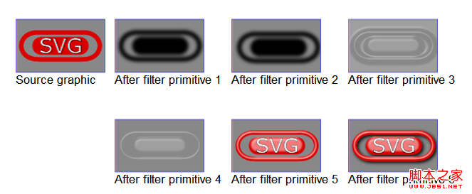 当在容器上(例如g元素)使用filter属性的时候,滤镜效果会应用到容器中的所有元素。但是容器中的元素并不会直接渲染到屏幕,而是会被暂时存储起来。然后,图形命令会被当做处理引用的filter元素的过程的一部分被执行,这个时候才会去渲染。这是通过使用SourceGraphic和SourceAlpha来指定的。下面的第二个例子中的第三种情况会演示这种效果。