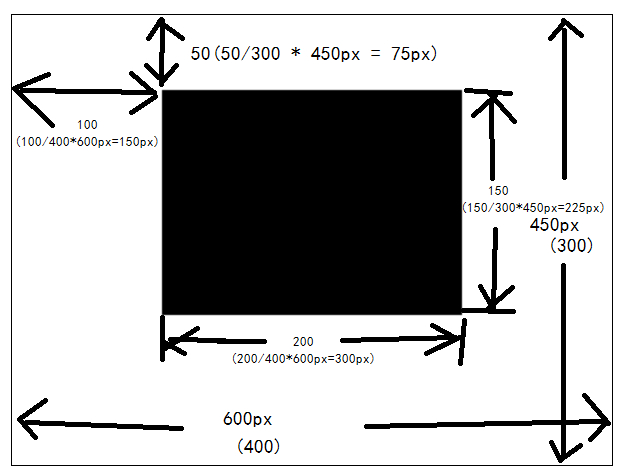 在canvas中画图是基于坐标的,所以100, 50的坐标转化成了150px,75px的屏幕坐标,矩形的大小也由200*150转换成300px*225px的屏幕大小。