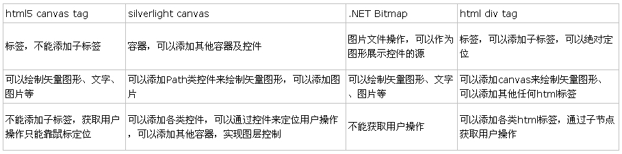 canvas具有绘图的功能,但是在用户交互上似乎比较乏力。拿silverlight的canvas、.NET的Bitmap、html的div与canvas对比了一下: