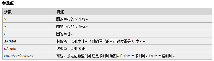 arc(x,y,r,sAngle,eAngle,counterclockwise) : 绘制一条指定半径的弧到点(x,y)。