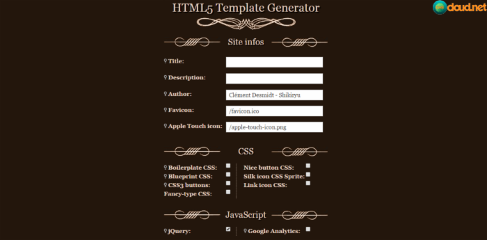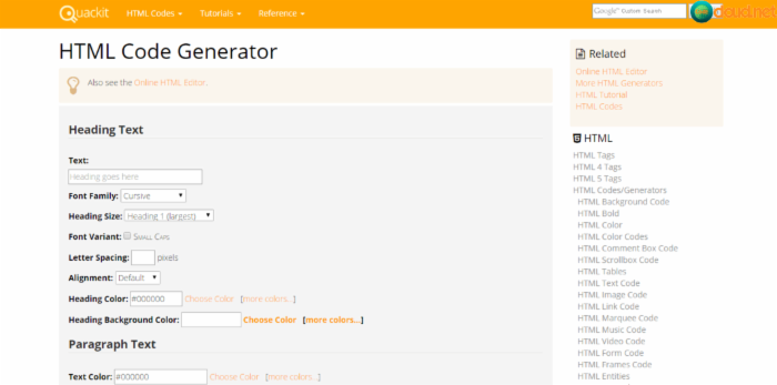 Quackit 不仅可以给你提供一系列的代码,还允许你输入你的所有信息。这对初学者非常有帮助。所以,如果一开始你学的是CSS和HTML,你就可以用这个生成器来简化你的工作任务了。这些生成器可以说是非常棒的,因为它们专注于圆角边框,阴影,颜色渐变以及和html5模板的设计。