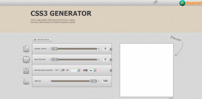 个人而言,我是很喜欢这个生成器, CSS3.me是由设计师Eric Hoffman设计出来的。它使用起来很简便,是一个轻量级的、个性化而又功能强大的生成器。你可以用它来设置透明度、下拉阴影,改变和设置圆角边框,增加渐变效果等等。